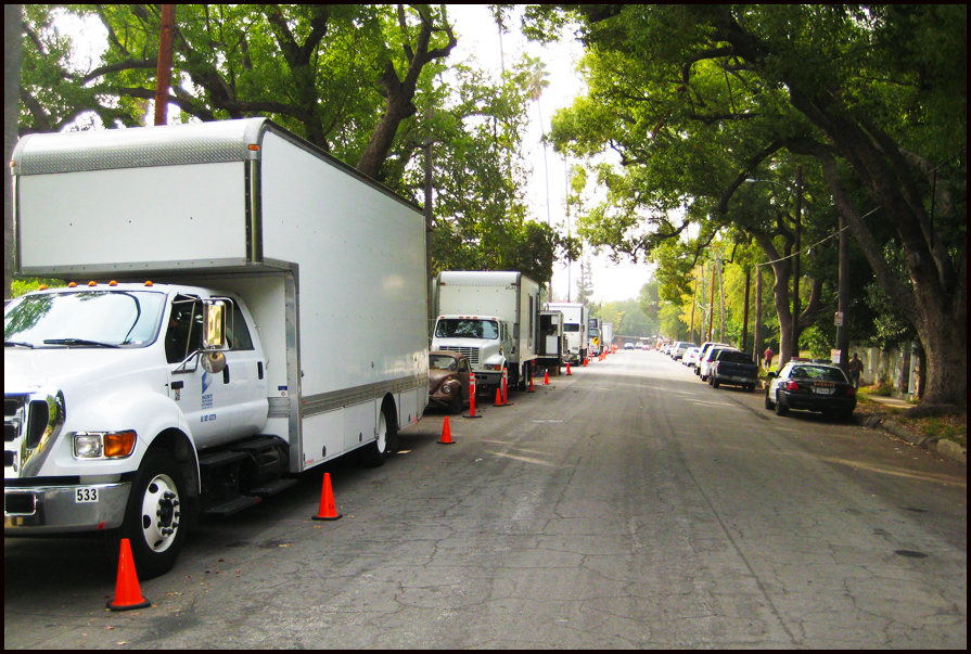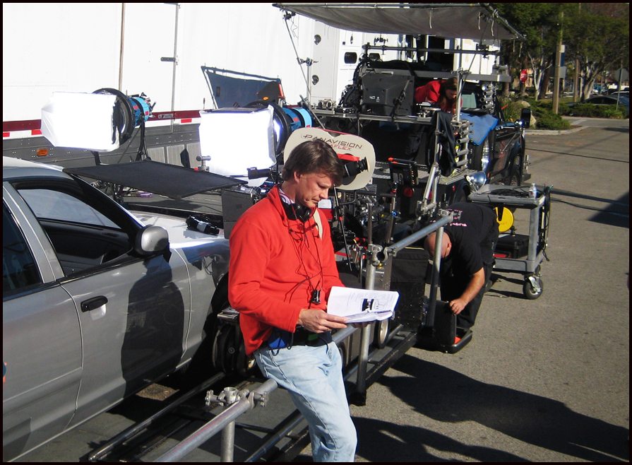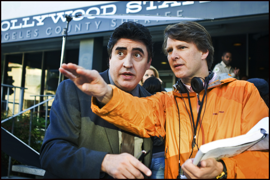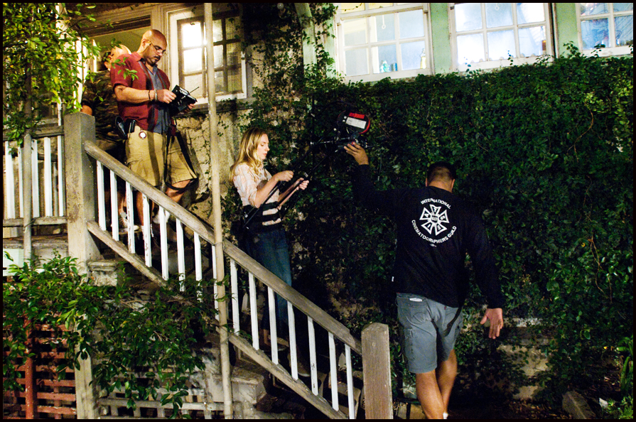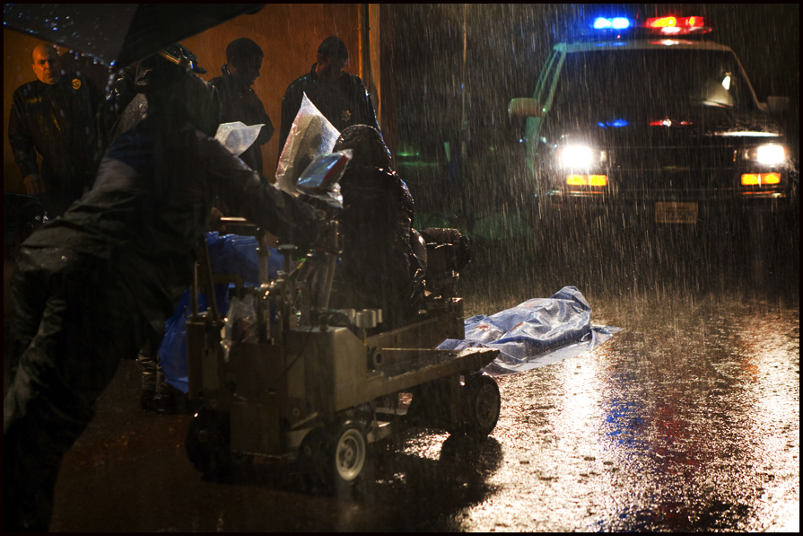 Jonathan Gesinski’s storyboards were used to pre-visualize the opening montage long before we started filming: pushing in on a map of West Hollywood, windshield wipers flapping against a window on a rainy night, POV driving down Sunset Boulevard, macro shots of a pen writing in red ink, close-up of a woman’s feet walking in the rain intercut with a close up of a man’s feet following her, pulling back from an extreme close up of a flashing red siren, arriving at the crime scene, pushing in on the covered body, Chandler’s (Alfred Molina) horrified reaction, and the crane shot rising high above the crime scene dissolving to a tracking shot along a quiet street toward the Bunting house the following morning.