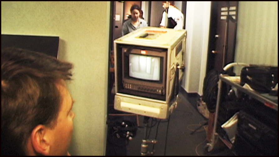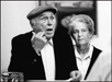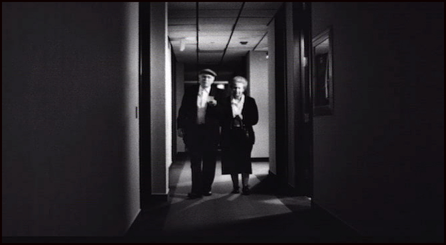 Over black, the film begins as we hear but do not see two elderly voices speaking a foreign language (Latvian). There is then a single long black and white shot of the elderly foreign couple, Kristo (Ernie Vincent) and Valda (Janet Rotblatt) walking toward us down a long dark hallway continuing to speak to each other in Latvian during the opening titles. While we have no idea what they are saying, it is clear they are concerned and agitated. Finally, the couple stops…we see fear on their faces. References the opening of The Lady Vanishes.